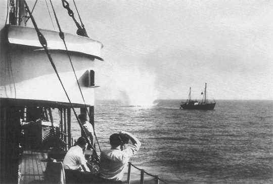 Wenige Sekunden nach der Sprengung nehmen beide Schiffe wieder Fahrt auf und steuern auf die nächste Schußposition zu. Aus Gründe der Sicherheit wird im allgemeinen noch ein drittes Schiff eingesetzt, das als Sicherheitsboot dafür zu sorgen hat, daß der Meß- und Schießvorgang störungsfrei abgewickelt werden kann, und daß er durch fremde Schiffe oder Fischer ungefährdet bleibt. Bei Messungen auf See fällt das an land so zeitraubende Bohren von Schußlöchern fort, und der Arbeitsfortschritt kann daher beträchtlich hochgeschraubt werden. Wichtig ist nur, daß die Sprengladungen stets in einer ganz bestimmten Wassertiefe gezündet werden.